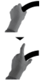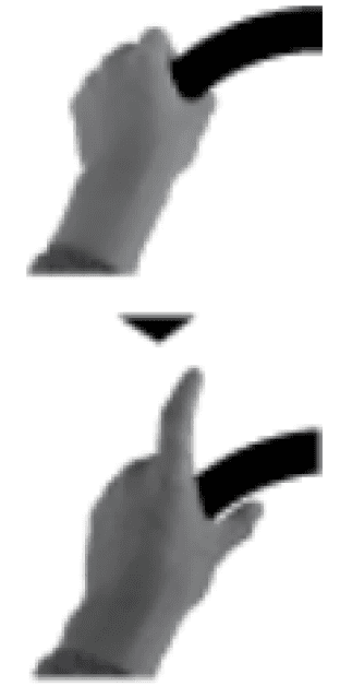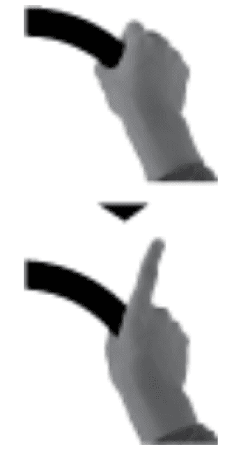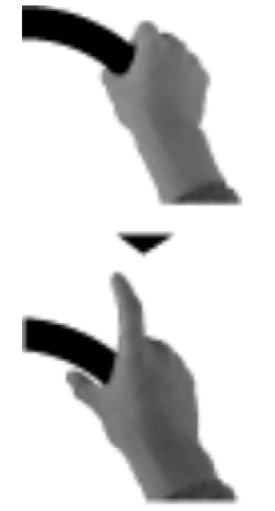 The driver, with both hands on the steering wheel while driving, manipulates non-driving-related functions. This gesture is performed without using the screen, distinguishing it from GUI-based interactions involving menus or icons on the screen.